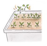 培養土が12ℓ程度入る、標準型(20×65×20cm程度)のプランターを利用します。プランターの底が見えなくなるぐらい鉢底石を敷き、ウォータースペースを1~2cmとり、用土1ℓ当たり粒状肥料「マイガーデンベジフル」を7gを混ぜた培養土を入れます。土の表面を平らにしてから、10~15cm間隔、深さ1cm程度のまき溝を2条つくって、タネを1cm間隔でまきます。覆土して土の表面を軽く押さえて、たっぷりと水やりしましょう。タネが発芽するまでは、土の表面が乾かない程度に水やりします。