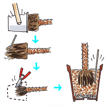 大きくしたい場合は毎年植え替えます。すでに大鉢で、これ以上大きくしたくない場合でも、3年に1回ぐらいは植え替えましょう。鉢を横に倒し、鉢縁を木片などで軽く叩いて、根鉢が鉢から外れたら、幹を上下にゆすって抜き取ります。取り出した根鉢の底部から少しずつ棒などで突いて、土の1/3ほどを落としたら、ハサミで繊維質の根を切り取りましょう。鉢底石を入れた鉢に、赤玉土中粒3、腐葉土1、川砂1の混合土で植えつけます。