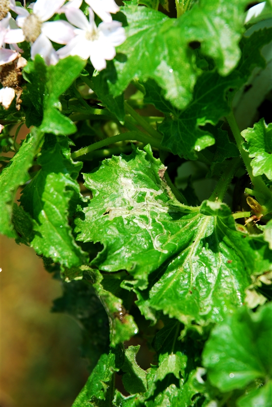 葉の表面に字を書いたような白い筋があったらハモグリバエの幼虫の食害を受けている。