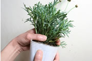 花苗の根元をしっかり手で支え、くるっとひっくり返してポリポットを外します。外れにくいときは、ポリポットを軽くもむようにすると、すぽっと抜けます。